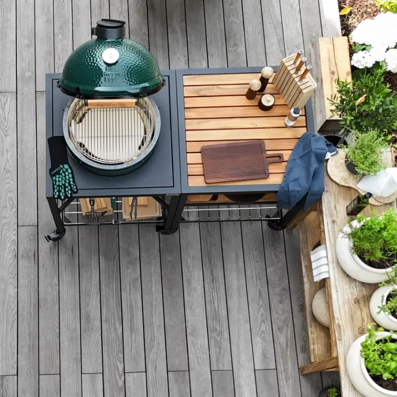 Modulární stůl BGE je víc než jen podstavec. Je to první modul venkovní kuchyně – základ ke kterému kdykoliv přidáš boční pracovní plochy, skříňky nebo rohový stůl. Gril se nepohybuje, stůl jede na kolečkách tam, kde ho potřebuješ.