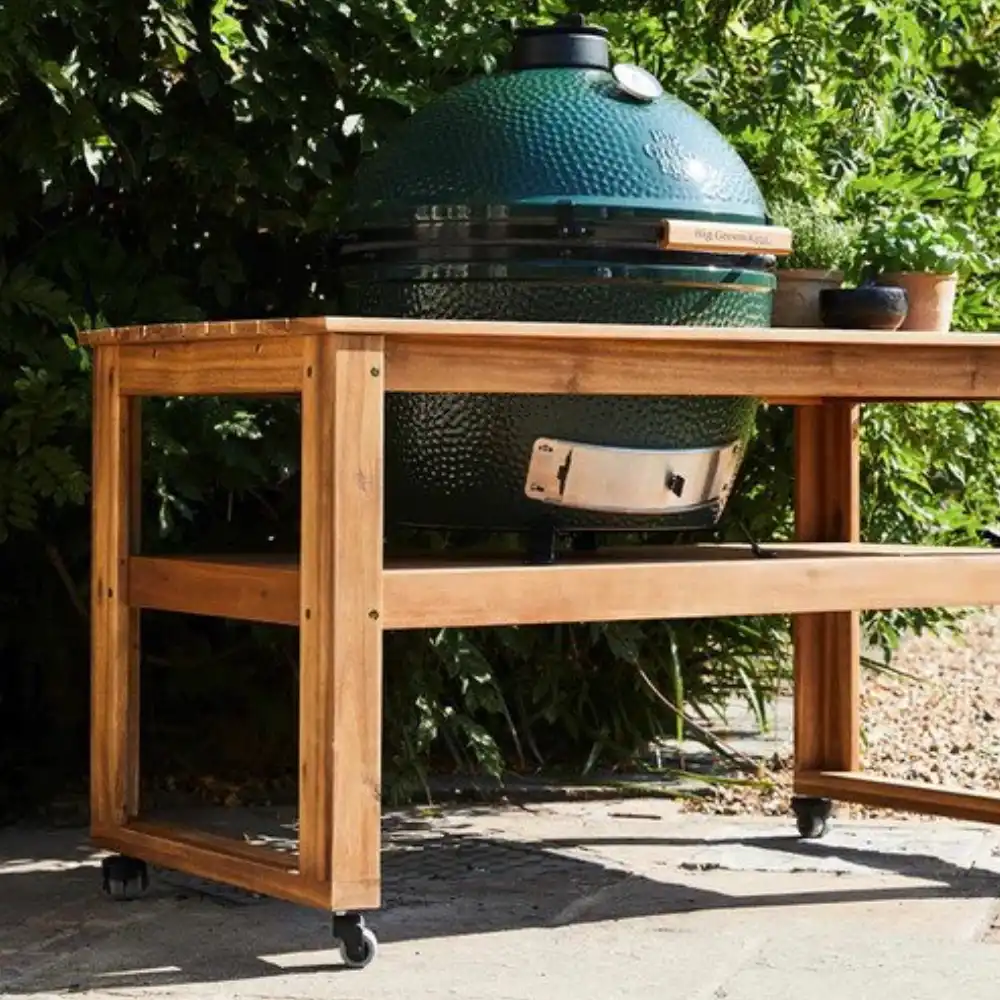 Gril je usazen do robustního stolu z eukalyptového dřeva, který vytváří plnohodnotné pracovní místo pro přípravu jídla venku. Dřevo je přirozeně odolné vůči vlhkosti a povětrnostním vlivům, takže stůl dobře funguje na terase i v zahradě.